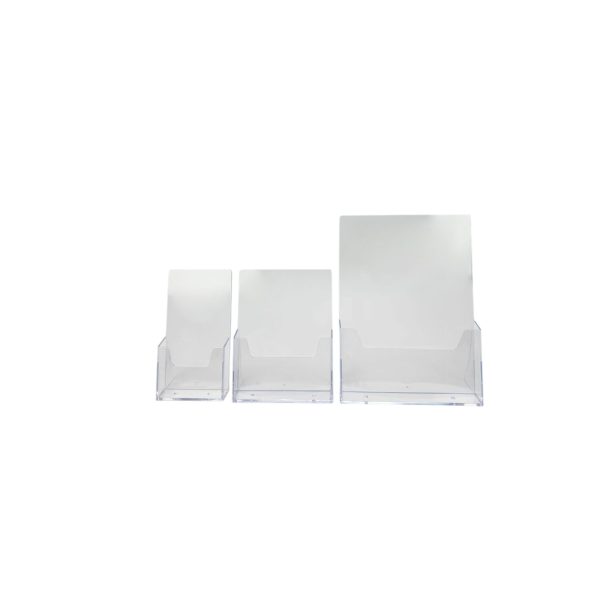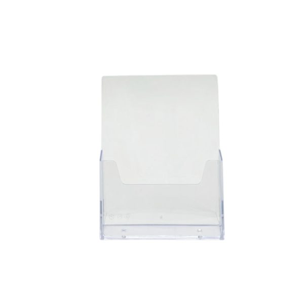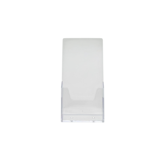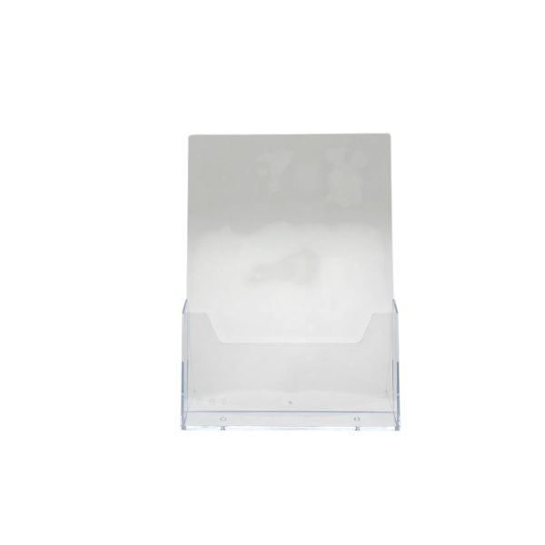 Suporte de folhetos de balcão em acrílico transparente, ideal para organizar e realçar panfletos, catálogos e folders. Com um design compacto e prático, é perfeito para utilização em balcões de lojas, receções e eventos.